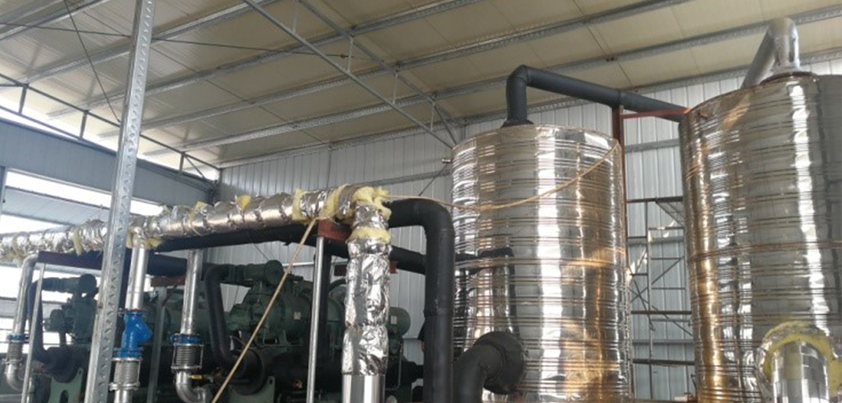 膠原卵白生產線使用,機組主要用來處理烘乾工藝。使用漢鐘精機LT-S-H單機雙級高溫熱泵壓縮機1台,熱水進出水溫:80/85℃,蒸發器進出水溫:18/13℃,為組合風櫃提供冷熱源冷熱同用,達到能效最大化。主要解決烘乾溫度高,烘乾速率快的問題,常規水源熱泵溫度最高65℃,熱風最高55℃左右,使用LT-S-H可以出水85℃,出風75℃左右,達到高效快速的烘乾速率。